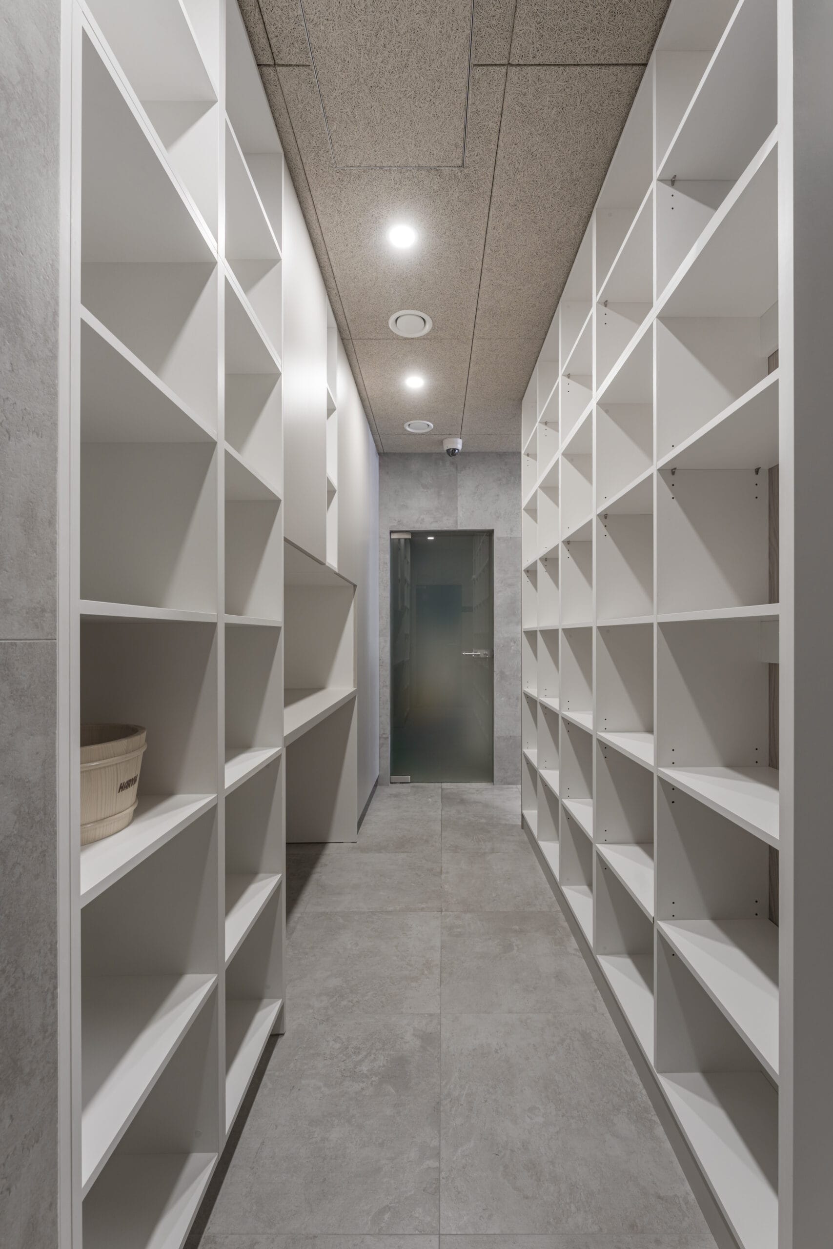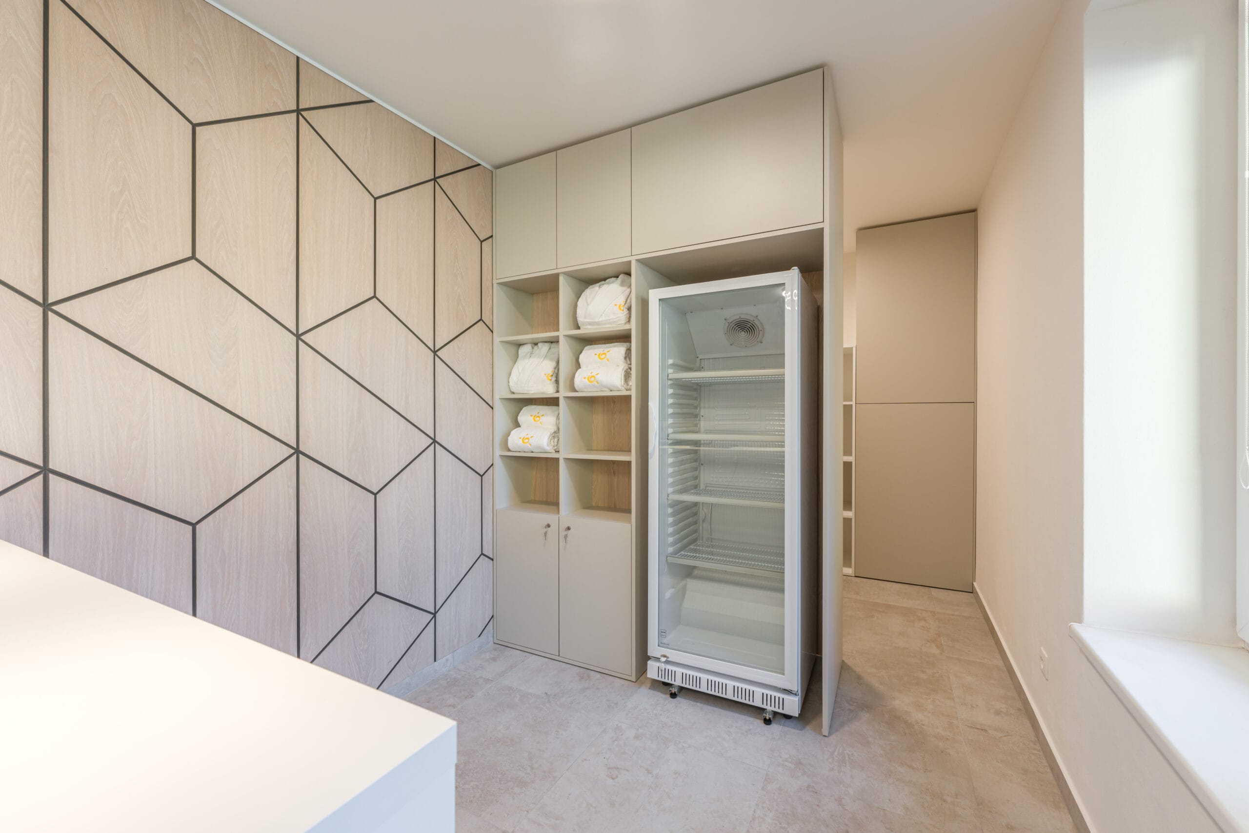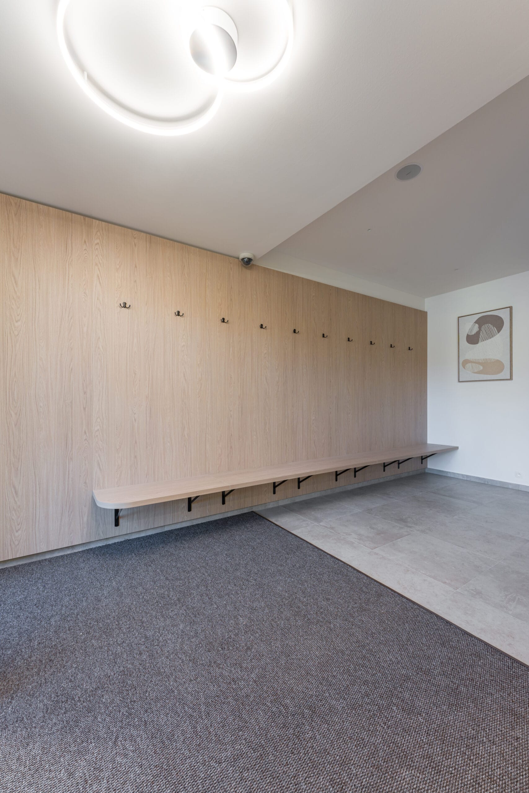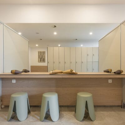 Významným prvkem interiéru jsou obloukové detaily, které se objevují například na lavicích nebo nábytkových hranách. Tyto měkčí linie zjemňují technický charakter šaten a přirozeně navazují na relaxační atmosféru wellness prostoru.