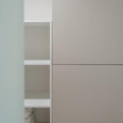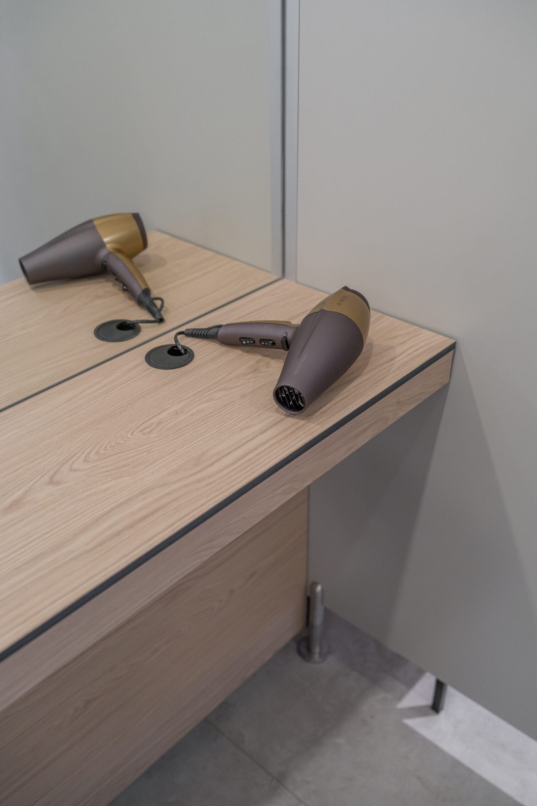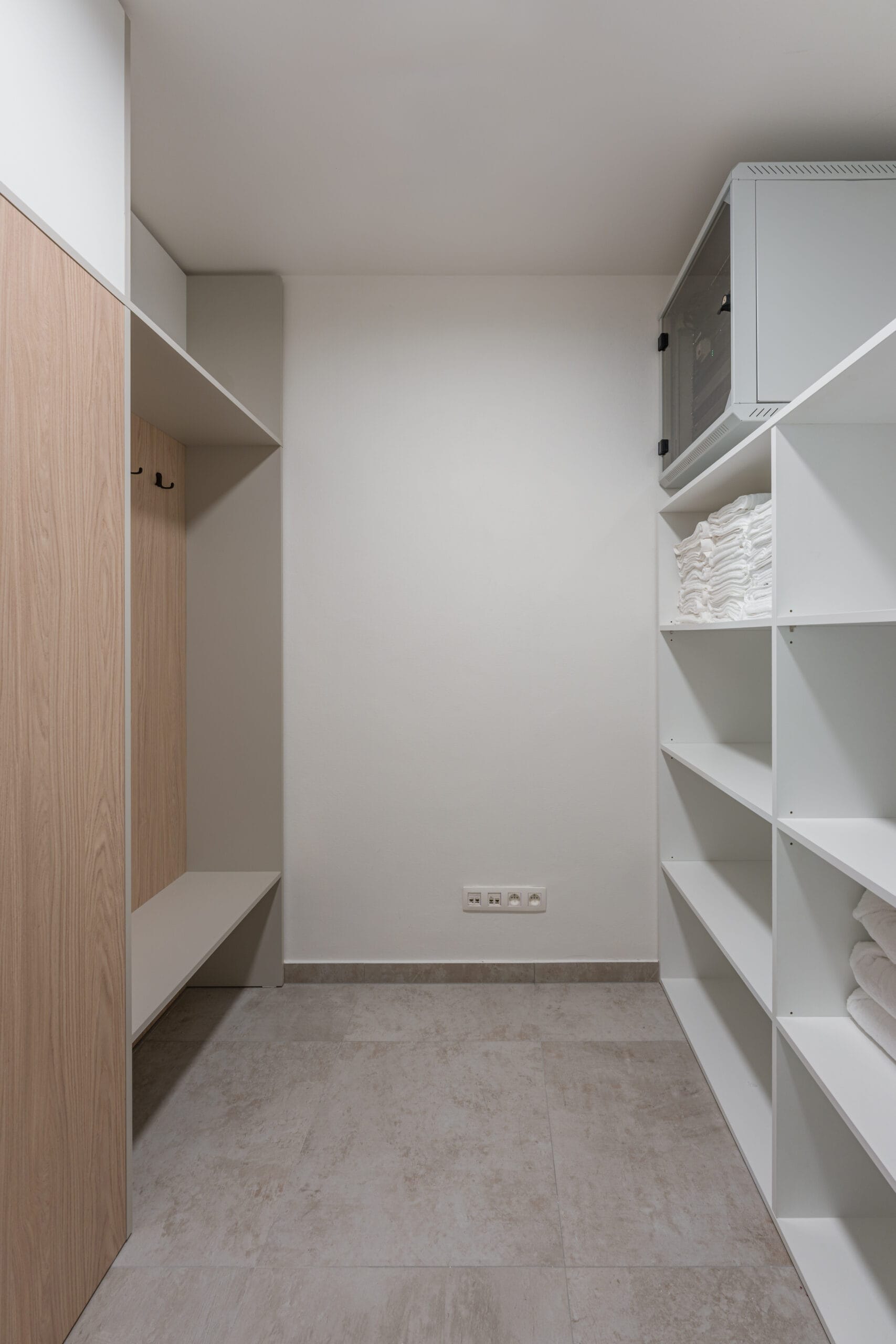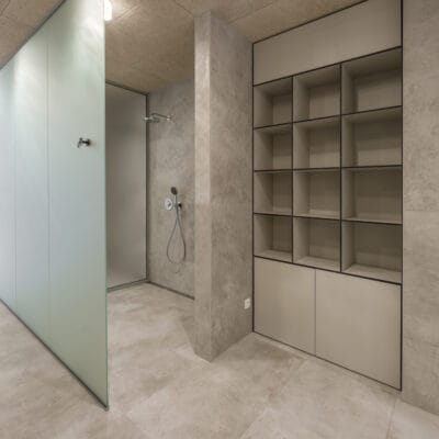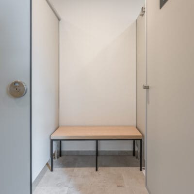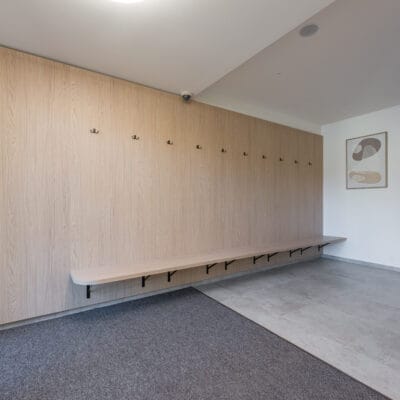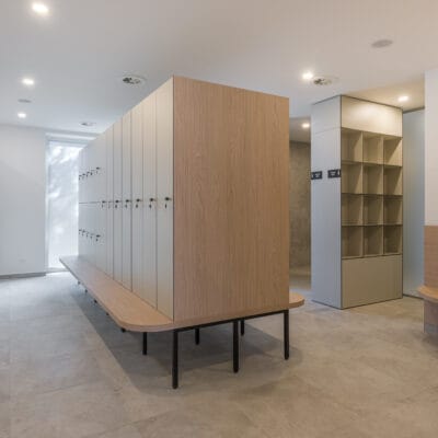 V šatnách jsme použili HPL kompaktní desky, které jsou ideální pro interiéry s vyšší vlhkostí a intenzivním provozem. Tento materiál vyniká vysokou odolností vůči vodě, mechanickému zatížení i snadnou údržbou, což je pro wellness provoz zásadní.