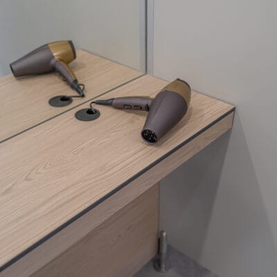 Celé řešení bylo navrženo s důrazem na dlouhodobou funkčnost a jednoduchou údržbu. Použité materiály i konstrukční řešení odpovídají nárokům hotelového provozu a zároveň zachovávají vizuální kvalitu prostoru.